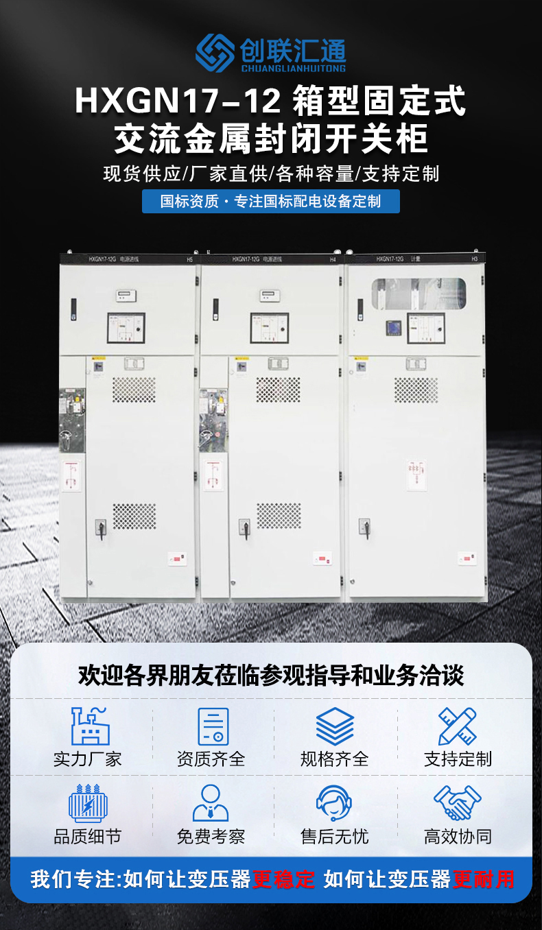 HXGN17-12系列開關柜高壓配電裝置由高壓斷路器、負荷開關、接觸器、高壓熔斷器、隔離開關、接地開關、互感器和站用變壓器,以及控制、測量、保護、調節裝置,內部連接件、輔件外殼和支持件等組成的成套配電裝置。