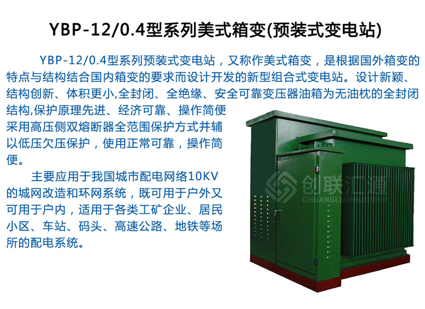 ●YBP-12/0.4型系列預(yù)裝式變電站,又稱作美式箱變,是根據(jù)外箱變的特點(diǎn)與結(jié)構(gòu)結(jié)合內(nèi)箱變的要求而設(shè)計(jì)開(kāi)發(fā)的新型組合式變電站。